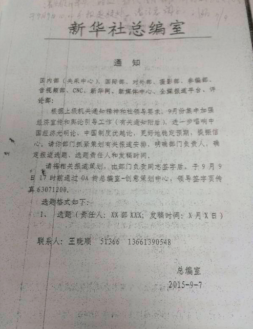 Как следует из статьи China Digital Times, 7 сентября правительственное Xinhua News Agency разослало крупнейшим новостным агентствам страны директиву, в которой предписывается «усилить экономическую пропаганду» в целях «управления общественным мнением» и создать позитивный новостной фон, в рамках которого следует обсуждать «светлое экономическое будущее страны и превосходство китайской модели». Также следует «стабилизировать ожидания» и «вдохнуть в читателей уверенность». Средствам массовой информации предписывается принять немедленные меры для составления соответствующих планов, назначить ответственных за проведение в жизнь обозначенной линии партии и правительства, подтвердить намеченные темы публикаций, их даты и так далее.