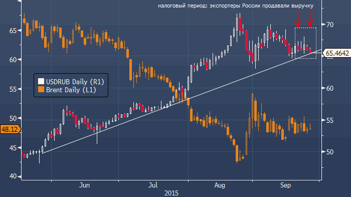 Рубль на позитивной ноте завершает последний день этой торговой недели. О том, что российская валюта будет предпринимать активные попытки роста в течение теперь уже прошедшей недели, мы писали утром в понедельник 21 сентября. Цены на нефть последние несколько дней простояли в узком диапазоне, в то время как российские экспортеры в рамках налогового периода продавали в течение недели экспортную выручку. Традиционно в последний день (сегодня) активность экспортеров является наиболее ощутимой. Так, согласно данным, составленным на основании опроса агентства Bloomberg, только в пятницу экспортеры должны совершить налоговые выплаты на 625 млрд. рублей, что приблизительно соответствует 9.5 млрд. долларов США.
