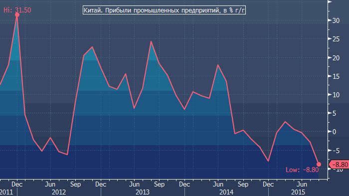 Прибыль компаний, добывающих уголь, в первые 8 месяцев этого года упала на 64.9% в сравнении с тем же периодом годом ранее. В секторе добычи нефти и газа прибыли сократились на 67.3%. В секторе черной металлургии прибыли упали на 51.6%. Основной причиной столь удручающих цифр является падение цен, низкие инвестиционные доходы и убытки, вызванные девальвацией юаня.
