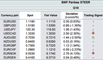 Валютные стратеги BNP Paribas обновили свою еженедельную оценку ситуации на валютном рынке, в подготовке которой используется квантовая модель «STEER», довольно успешно зарекомендовавшая себя с точки зрения точности своих прогнозов. Напомним, что данный банк является пионером использования данного подхода к оценке «справедливости» текущих валютных курсов. Основу данной методики представляет взаимосвязь между процентными ставками, стоимостью акций и цен на сырьевые товары. Ниже приведена таблица с указанием валютной пары, ее текущего курса, «справедливой» цены, дельты между двумя предыдущими параметрами и сигналом на покупку/продажу.