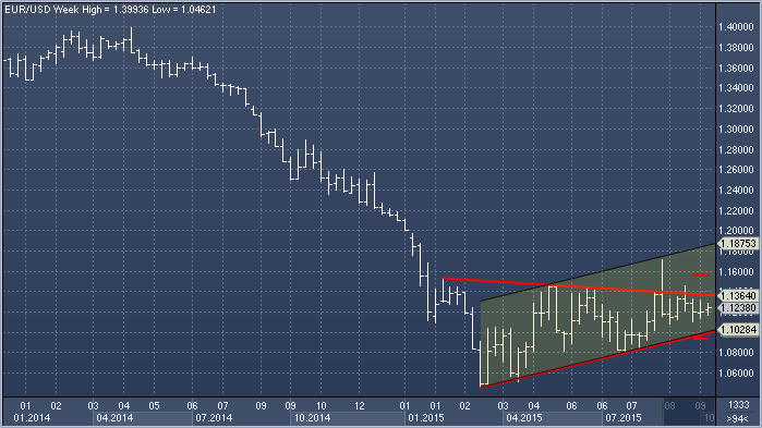 Евро/доллар: продолжает консолидироваться в широком многомесячном треугольнике, и в краткосрочной перспективе не исключена попытка роста в область $1.1565. Если паре удастся прорваться выше этого сопротивления, то следующей целью станет область прохождения верхней границы восходящего недельного канала около $1.1875. Ближайшая важная поддержка отмечена около $1.1085, а в случае ее пробития под угрозой окажется основание консолидационного треугольника около $1.0940;