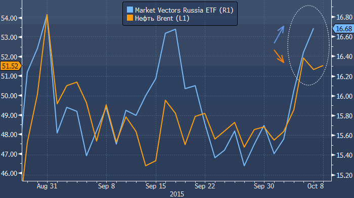 Учитывая эти обстоятельства, не сложно понять, почему последние полгода — как только наметились признаки стабилизации и даже некоторого восстановления цен на нефть — американские инвесторы проявляют интерес к биржевому инвестиционному фонду российских акций. Многие надеются на то, что постепенное удорожание энергоносителей будет способствовать росту корпоративных прибылей и хотят успеть купить сейчас, пока дешево. В частности, Market Vectors Russia ETF — индексный фонд управляющей компании Market Vectors, копирующий динамику крупнейших и наиболее ликвидных российских компаний, единственный американский ETF, нацеленный на российский рынок — во вторник сообщил о чистом притоке капитала в размере 45,3 млн долларов. Чуть менее половины активов фонда (46%) представлено акциями компаний, так или иначе связанных с добычей природных ресурсов, таких как крупнейших экспортер природного газа Газпром, нефтедобывающий гигант Лукойл, крупнейшая в России буровая компания «Евразия». Динамика Market Vectors Russia ETF, безусловно, связана с конъюнктурой нефтяного рынка. Однако в среду нефть Brent подешевела на 59 центов до 51,33 доллара за баррель, поскольку данные по объему запасов в США снова зафиксировали рост. Но Market Vectors Russia ETF при этом подскочил на 1,5% до 16,68 долларов, закончив торги в Нью-Йорке на максимуме с 31 августа. Источник: ProFinance.Ru - Новости рынка Forex