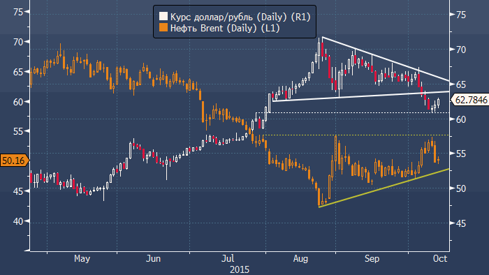 Как было отмечено в комментариях, опубликованных еще в прошлую пятницу, текущая неделя благоприятствует ослаблению российского рубля. Следуя за динамикой нефтяных котировок, протестировавших на прошлой неделе верхнюю границу своего диапазона, курс доллар/рубль до конца недели не имеет препятствий для роста вплоть до уровня 65.00. Ключевой вопрос — смогут ли цены подняться выше и снова протестировать область 70 рублей за единицу американской валюты? В перспективе текущей, а также следующей недели это выглядит маловероятно. Однако пока такое развитие событий, если брать во внимание перспективу конца текущего года, не может быть исключено.