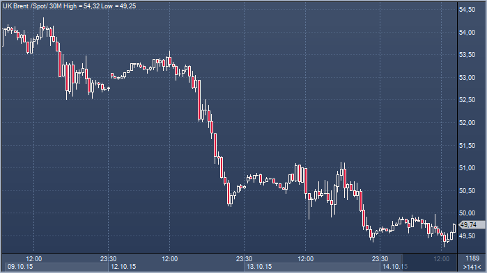Мировые цены на нефть не оставляют попыток скорректироваться, но все они пока выглядя безуспешно. Рынок закономерно просел после резкого роста в октябре на фоне сохраняющихся опасений инвесторов относительно глобального переизбытка сырья в условиях падения спроса. По состоянию на 13.53 мск стоимость декабрьских фьючерсов на североморскую нефтяную смесь марки Brent снижалась на 0,45% - до 49.47 доллара за баррель. Цена ноябрьских фьючерсов на нефть марки WTI опускалась на 0,26% - до 46.54 доллара за баррель. В начале месяца нефть марки Brent поднималась в район отметки 53 долларов за баррель на ожиданиях, что снижение добычи среди крупнейших производителей нефти приведет к сокращению поставок "черного золота".