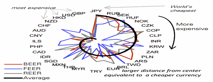 1. Фунт/иена является самой дорогой валютной парой в мире. Представленная нами диаграмма, построенная на основании трех разных методологий оценки равновесного валютного курса, располагает разные валюты по шкале рейтинга от самой дорогой к наиболее дешевой. Как видно, фунт в мировом масштабе является самым дорогим, а иена самой дешевой.