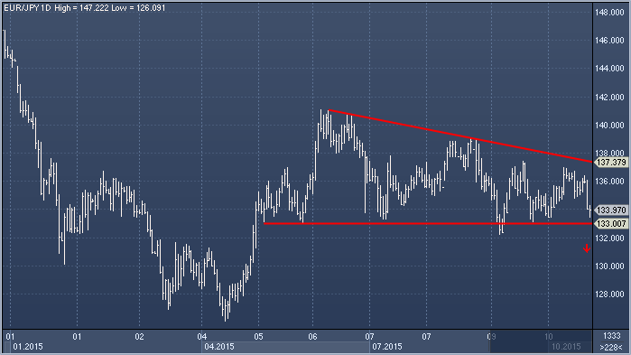Евро/иена: упала вместе с другими евро-кроссами, однако не так сильно, как евро/доллар. Поэтому мы думаем, что в краткосрочной перспективе здесь еще есть место для дальнейшего снижения, например, к Y132.88. Более масштабная картина представляет собой нисходящий дневной треугольник, намекая на возобновление долгосрочного даунтренда после пробития поддержек Y132- Y133;