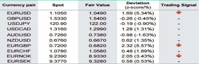 Валютные стратеги BNP Paribas обновили свою еженедельную оценку ситуации на валютном рынке, в подготовке которой используется квантовая модель «STEER», довольно успешно зарекомендовавшая себя с точки зрения точности своих прогнозов. Напомним, что данный банк является пионером использования данного подхода к оценке «справедливости» текущих валютных курсов. Основу данной методики представляет взаимосвязь между процентными ставками, стоимостью акций и цен на сырьевые товары. Ниже приведена таблица с указанием валютной пары, ее текущего курса, «справедливой» цены, дельты между двумя предыдущими параметрами и сигналом на покупку/продажу.