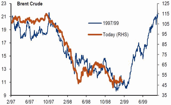 Еще более интересна история с нефтью, которая в 98-99 годах рухнула несколько позже, выросла также позже, но продемонстрировала еще более впечатляющий рост на фоне возобновления экономического роста на развивающихся и развитых рынках. Если верить приведенному ниже графику и экстраполировать текущую ситуацию в будущее, то через те же самые полгода мы можем увидеть Brent около отметки $115. Источник: ProFinance.Ru - Новости рынка Forex