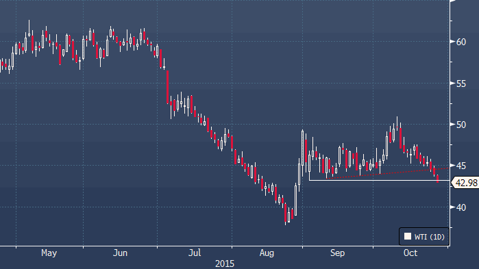 Нефть в последние дни демонстрирует медленное, но весьма устойчивое снижение, и в данный момент декабрьский контракт WTI держится у свежих минимумов сессии в районе $42.95. Настрой остается подавленным, что, в частности, объясняется ожиданиями неблагоприятного отчета DOE по запасам нефти и нефтепродуктов. Кроме того, ряд аналитиков указывает на замедление темпов сокращения числа буровых установок, как негативный фактор для быков, а также на рост напряженности в преддверии заседания FOMC. C технической точки зрения события последних дней предполагают ухудшение краткосрочных перспектив, и прорыв минимумов сентября вблизи $43.21 означает смещение фокуса к $42.79 (61.8% от восстановления с августа). Потеря опоры здесь будет дополнительным доводом в пользу развития снижения в направлении $40.87 и $40.00. Вместе с тем, близость решения по ставкам ФРС может побудить спекулянтов, настойчиво продававших нефть последние три недели, зафиксировать прибыль. Источник: ProFinance.Ru - Новости рынка Forex