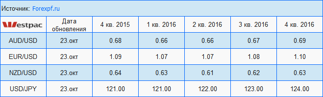 Таблица валютных прогнозов от Westpac