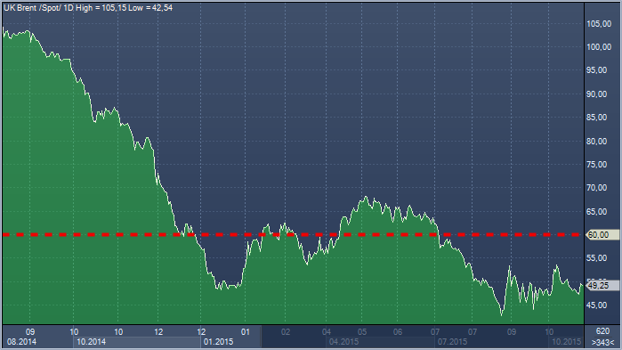Помимо того, что предложение нефти по-прежнему высокое, темпы роста спроса, как ожидается, будут снижаться из-за ослабления китайской экономики. Согласно опросу 13 банков, проведенному Wall Street Journal, средняя цена нефти Brent в следующем году составит 58 долларов за баррель, а цена нефти WTI – 54 доллара за баррель. В четверг нефть Brent торговалась около 48.50 долларов за баррель, а нефть WTI торговалась около 45.00 доллара за баррель.