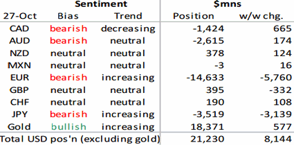 Как следует из последних данных CFTC, за неделю до 27 октября объем чистой длинной спекулятивной позиции по доллару вырос сразу на $8.1 млрд, что стало рекордным значением с прошлого августа. Основную лепту внесло массовое возвращение на рынок медведей по евро и иене, которые наряду с аусси и луни, остаются наиболее проданными основными валютами. Что касается франка, фунта, киви и мексиканского песо, то здесь настрой спекулянтов носит нейтральный характер. За неделю спекулянты нарастили объем чистого шорта по евро на рекордные с мая 2014 года $5.8 млрд (прим. ProFinance.ru: до $14.6 млрд, наивысшего значения за последние два месяца). Что касается иены, то еще недавно спекулянты занимали нейтральную позицию, однако за неделю до 27 октября объем спекулятивного шорта по ней вырос сразу на $3.1 млрд, что создает предпосылки дальнейшего ухудшения настроя участников рынка по отношению к японской валюте. Четвертую неделю подряд сокращается объем спекулятивного шорта по луни, однако отсутствие явного прогресса в котировках доллар/луни создает риски возобновления даунтренда канадской валюты. Источник: ProFinance.Ru - Новости рынка Forex