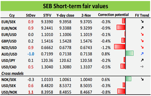 Валютные стратеги SEB обновили таблицу, в которой приведена краткосрочная «справедливая стоимость» основных валют, рассчитанная с использованием квантовой модели банка. В таблице указаны: валютная пара, стандартное отклонение, краткосрочная «справедливая стоимость», предыдущее закрытие, курс на 2 ноября, потенциал коррекции, а также текущий тренд. Источник: ProFinance.Ru - Новости рынка Forex
