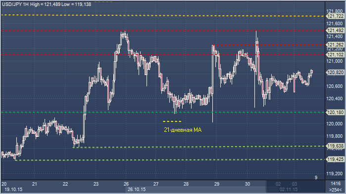 Сопротивление 2: Y121.45/49 — максимумы 26 и 30 октября