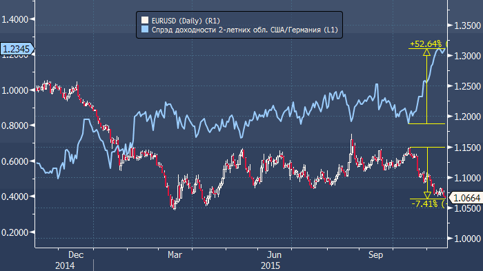 В то время как расхождение в денежно-кредитных политиках и соответствующее им изменение спрэда доходности облигаций указывают на более низкий курс евро/доллар, изменение глобальной картины рисковых активов является той противоположной силой, которая поддерживает единую валюту. Акции и сырьевые активы попали под новую волну давления. При этом укрепление доллара США против валют развивающихся стран также является отрицательным фактом для риска и положительным фактом для евро.