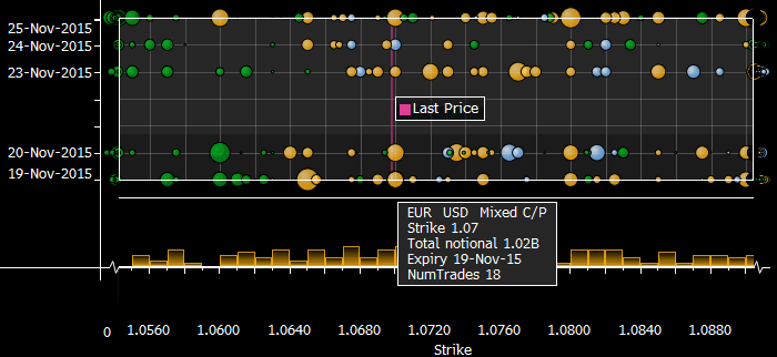 | Как пользоваться графической информацией, представленной ниже? На графиках в виде кругов, размер которых зависит от объема, представлены страйки опционов (по оси Х), сроком истечения которых наступает в указанную дату (ось Y). В целях наглядности графически обозначены лишь те опционные контракты, объем которых выше 20 млн. Голубой цвет — Call. Зеленый цвет — Put. Желтый цвет — Mixed C/P. Источник данных: Депозитарная Трастовая и Клиринговая Корпорация (DTCC). Просьба свои замечания и пожелания относительно формата и содержания предоставляемой на сайте аналитической информации направлять по адресу: analytics@forexpf.ru |