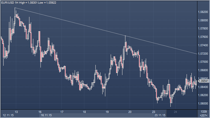 Между тем, отчеты из Еврозоны также неспособны добавить драмы в ход торгов — участники рынка продолжают гадать о том, какая комбинация мер будет использована ЕЦБ, и причин для усиления позиций «пессимистов» пока не заметно. Стоит отметить, что заседание ЕЦБ уже не за горами (намечено на 3 декабря), и, в то время как наращивание стимулирования, особенно снижение ставки по депозитам, обещает придать импульс падению евро, непосредственной реакцией рынка на решение центробанка вовсе не обязательно будет распродажа единой европейской валюты. Более того, учитывая достаточно односторонний характер движения евро/доллара в последние недели, а также рост чистой короткой позиции спекулянтов в евро (пусть она и далека от рекордных уровней, но значительна: по данным CFTC, нетто-шорт во фьючерсах 17 ноября составил 164 177 контракта), ребалансирование экспозиции инвесторами может стать лейтмотивом торгов в ближайшие дни, в том числе на рынке облигаций (в последнее время здесь наблюдался рост доходности по американским облигациям и ее снижение по немецким).