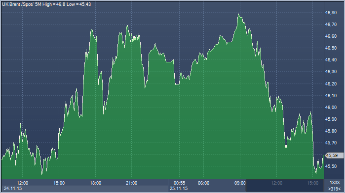 Цены на нефть возобновили снижение после того, как накануне достигли двухнедельного максимума. Геополитическая напряженность немного ослабла, что нашло отражение в падение спроса на защитные активы, а также нефть. Ранее министр иностранных дел России заявил, что Россия не собирается воевать с Турцией. Несколько минут назад появились и вовсе примирительные сообщения. Необходимым условием для нормализации отношений между Россией и Турцией является признание Анкарой абсолютной недопустимости нападений, подобных инциденту с Су-24, заявил Сергей Лавров.