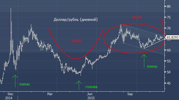 Всем известно, что главным фактором, влияющим на курс рубля, является динамика нефти. Главным, но не единственным, так как, глядя на длинные графики, можно сделать нехитрый вывод о том, что нефть по $40 мы уже видели и раньше, например, в 2004 и 2008-2009 годах, а вот доллар/рубль по 60-70 увидели только много лет спустя. Что касается нефти, то, открыв Bloomberg или Reuters, можно увидеть огромное количество прогнозов, варьирующихся от $5 до $255 на любом временном интервале, и каждый из них так или иначе обоснован. Поэтому мы просто предположим, что при прочих равных в среднесрочной перспективе нефть останется в диапазоне $40-$50, и курс доллар/рубля будет определяться в большей степени внутренними факторами. Эта пара находится в 22-летнем даунтренде, и мы сфокусируемся на поиске фигур продолжения, так как, на наш взгляд, для глобального разворота необходимы структурные изменения в экономике, и одного только «carry» для этого явно недостаточно. Итак, за последний год доллар/рубль сформировал перевернутую фигуру «голова-плечи», которая плавно превратилась в «чашку с ручкой». Учебники теханализа говорят о том, что надо покупать на росте выше 66.50 и 67.15 с целями около 75 (примерная цель реализации «чашки с ручкой») и 90 (примерная цель реализации перевернутой фигуры «голова-плечи») со стопом на закрытии дня около 64. Сыроваткин Олег Источник: ProFinance.Ru - Новости рынка Forex