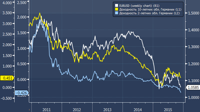 Ожидания дополнительных стимулирующих мер от ЕЦБ положительным образом сказались на рынке инструментов с фиксированной доходностью в еврозоне. Доходности по облигациям с коротким сроком до погашения находятся на рекордно-низких уровнях. Доходности по среднесрочным и долгосрочным облигациям, как видно, также ощущают воздействие и снижаются. Взаимосвязь между динамикой доходности 10-летних германских облигаций и курса евро/доллар остается очень высокой. Исходя из текущей динамики доходности цены в евро/долларе должны продолжать падение. Отчасти это должно отражать диверсификацию портфелей с целью уменьшить в них долю низкодоходных активов еврозоны.