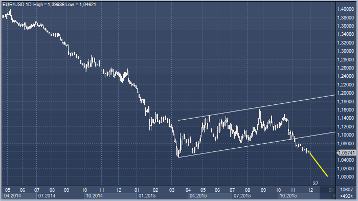 Предущее заседание ЕЦБ было 22 октября и тогда в своих комментариях валютные стратеги Goldman Sachs в качестве ближайшей цели назвали уровень 1.0500 в паре евро/доллар. Поскольку текущие цены находятся в непосредственной близости от этой отметки, эксперты данного банка видят возможность еще более существенного падения цен в день заседания ЕЦБ, а также в день публикации решения FOMC по ставкам 16 декабря.