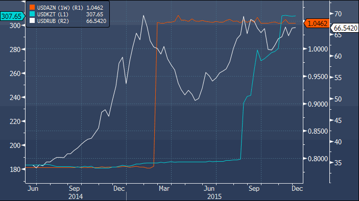 Падение цен на нефть оказало весьма существенное влияние на динамику целого ряда валют — от канадского доллара и норвежской кроны до рубля и казахского тенге — и также внесло изменения в позицию ряда центральных банков. Ослабление рубля, отправившегося в свободное плавание, позволило смягчить удар по золотовалютным резервам и экономике, а также весьма позитивно отразилось на финансовых показателях российских нефтяных компаний. В августе, когда цены на нефть рухнули к минимальным уровням с марта 2009 года, примеру России последовал и Казахстан, в результате чего тенге потерял около 30%, при этом казахстанская валюта в последующие месяцы продолжила снижение. На этом фоне азербайджанский манат оставался незыблем (если не считать девальвации в феврале), однако это дорого обошлось стране, для которой нефть также является важной статьей экспорта. В Bank of America отмечают, что на поддержания курса маната Азербайджан потратил порядка 25% своих резервов, и в нынешней ситуации, когда нефть остается склонная к развитию падения, продолжение такой политики выглядит нереалистичным. В BoA считают, что Азербайджану придется отказаться от привязки курса маната к доллару уже в ближайшее время, и либо девальвировать его на 30% - 35%, либо последовать примеру России и Казахстана и ввести режим свободноплавающего валютного курса. Источник: ProFinance.Ru - Новости рынка Forex