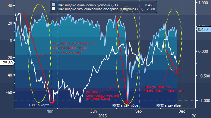 На графике уделено внимание разрывам в значениях показателей, которые предшествовали мартовскому заседанию Комитета по операциям на открытом рынке (FOMC) ФРС США и сентябрьскому заседанию. Предшествовавший мартовскому заседанию FOMC разрыв был обусловлен резким снижением индекса экономического сюрприза. Если вспомнить, то тогда плохую экономическую статистику списали на плохие погодные условия и простаивания портов в США. Разрыв, прешествовавший сентябрьскому FOMC, был обусловлен резким падением в отрицательную зону индекса финансовых условий. Причиной был обвал фондового рынка в Китае. Если вспомнить, то в заключительной инструкции сентябрьского заседания, на котором ставки так и не были повышены, были комментарии относительно ужесточения финансовых условий, как одна из причина обоснования продолжения паузы.