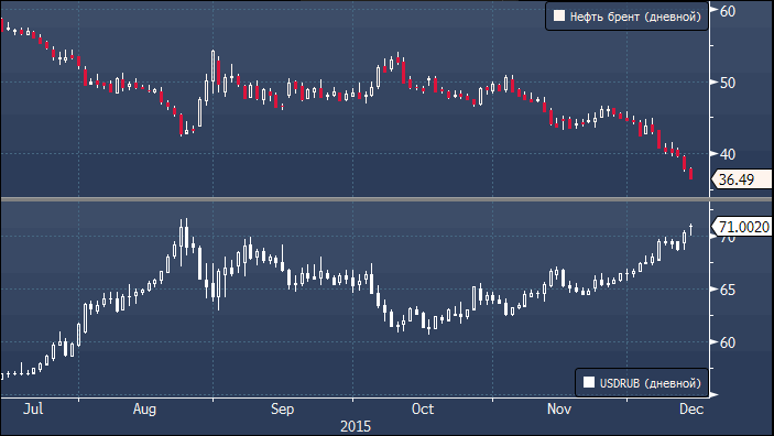 Для нефти новая неделя началась крайне неудачно: стабилизация вблизи $37.30 оказалась лишь паузой перед новой волной продаж, на которой «черное золото» достигло свежих минимумов в районе $36.62 за баррель. Российская валюта на этом фоне также продолжила снижение, однако она по-прежнему сдает позиции куда менее поспешно, в результате чего стоимость нефти брент в рублях к настоящему времени установила свежих пятилетних минимумов в районе 2586 рублей за баррель. Доллар/рубль в настоящее время держится у свежих максимумов сессии в районе 71.13, и штурм сопротивления в районе 71.63/69 (линия сопротивления с 01/15 и максимумы августа) выглядит неизбежным. Прорыв выше будет предполагать смещение фокуса к уровням в районе 75 рублей за доллар. Евро/рубль, тем временем, держится уже выше 78, и под прицелом теперь находится отметка в 80. Источник: ProFinance.Ru - Новости рынка Forex