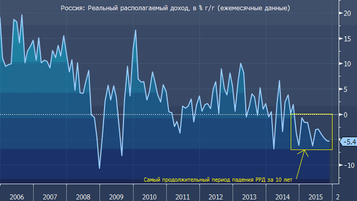 Реальный располагаемый доход (реальный доход после уплаты налогов) в ноябре 2015 года сократился на 5.4% по сравнению с ноябрем 2014 года. Данные оказались хуже прогнозных оценок (ожидалось снижение на 5.2% г/г). При этом октябрьские цифры были пересмотрены немного в сторону улучшения. Так падение реального располагаемого дохода в октябре составило не 5.6% по сравнению с октябрем 2014 (как сообщалось в первом чтении), а 5.3% г/г.