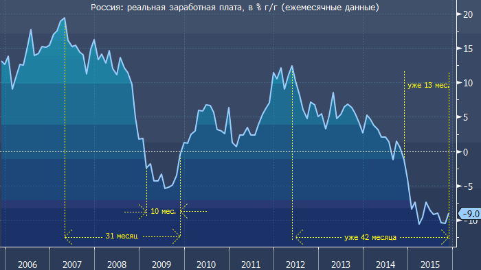 Реальная заработная плата, то есть зарплата с поправкой на инфляцию или показатель покупательной способности в ноябре 2015 года сократилась на 9.0% по сравнению с аналогичным месяцем годом ранее. При этом фактическое значение оказалось лучше ожиданий, поскольку прогнозировалось падение показателя на 10.2% г/г. Данные за октябрь были пересмотрены в сторону незначительного улучшения. В октябре 2015 года реальные заработные платы упали не на 10.9% г/г, как сообщалось в первом чтении, а на 10.5% г/г.