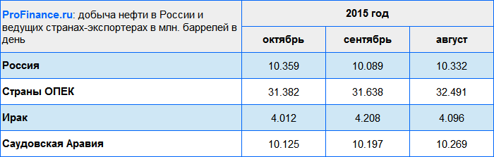 В таблице ниже представлены сравнительные данные о добыче нефти в РФ и ведущих странах-экспортерах. Цифры по России не учитывают газовый конденсат. Данные по добычи странами Картели взяты из ежемесячного отчета ОПЕК за октябрь 2015 года.