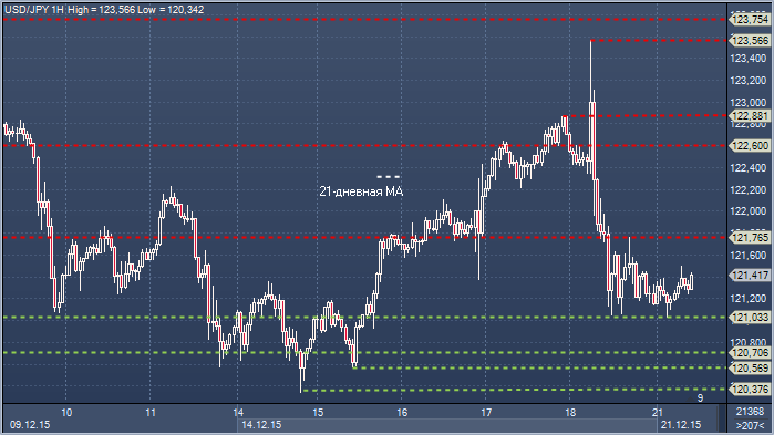 Поддержка 1: Y121.03 - минимум 18 декабря, часовая поддержка 21 декабря