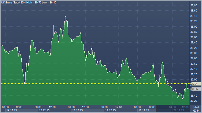Цена нефти Brent упала до минимального уровня с 2004 года из-за избытка нефти на мировом рынке. Производители топлива в борьбе за долю рынка могут усилить дисбаланс спроса и предложения. Сектор сланцевой нефти в США продолжает смущать скептиков. Данные, вышедшие в пятницу, показали, что число буровых установок на прошлой неделе выросло на 17 единиц. Это указывает на то, что падения добычи, которое предсказывалось на начало 2016 года, не произойдет, и для сокращения производства потребуется намного больше времени. Ожидается, что добыча нефти в США к середине 2016 года сократится с уровней около 9,1 млн баррелей в день до 8,6 млн баррелей в день.