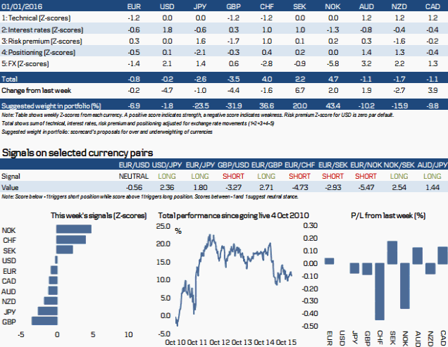 На этой неделе наша торговая система G10 FX Financial Scorecard рекомендует к покупке: норвежскую крону, франк и шведскую крону, а к продаже: фунт, иену и киви (вес в общем портфеле указан в таблице ниже). Рекомендации прошлой недели привели к убытку в размере 0.6%. Наиболее убыточными оказались продажи франка и норвежской кроны. Следующие сигналы модели будут опубликованы 11 января.