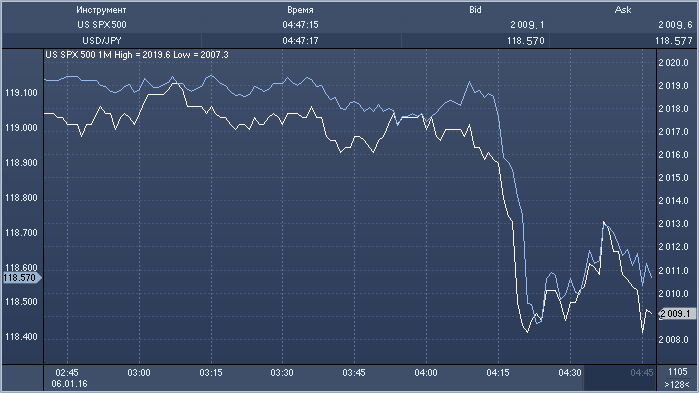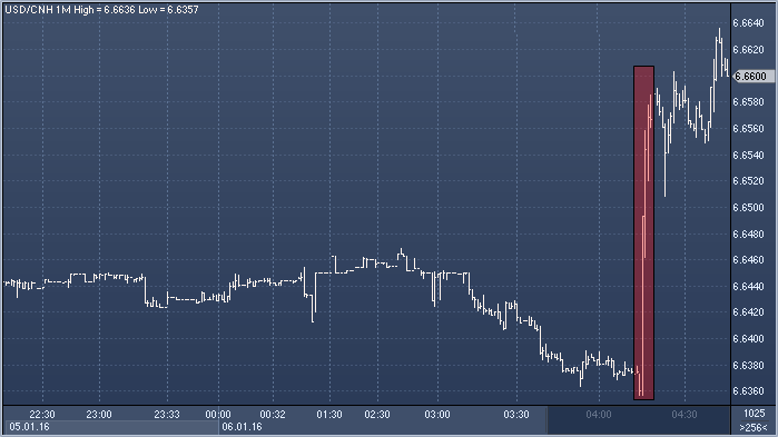 Несколько минут назад в рамках ежедневного фиксинга Банк Китая понизил курс юаня на 0.22% (прим. ProFinance.ru: рекордная с 3 ноября величина) и теперь «официальный» материковый доллар/юань стоит 6.5314. Отметим, что в рамках торгов курс этой пары не может отклоняться от фиксинга более чем на 2% в любую сторону. В результате спред между материковым и «оффшорным» юанем, который используется в качестве индикатора потенциала будущей девальвации, достиг рекордных 1429 пипсов. Как это обычно бывает, девальвация юаня привела к резкому росту антирисковых настроений и иены, а также снижению «валют роста», вроде аусси и киви и фьючерсов на фондовые индексы. Источник: ProFinance.Ru - Новости рынка Forex