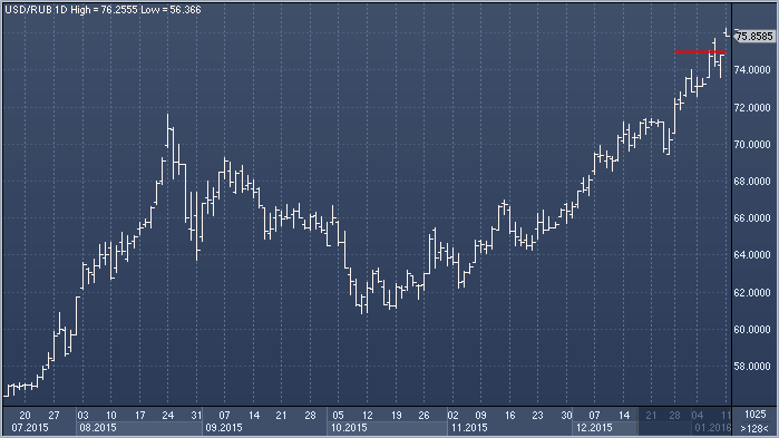 Рубль начинает новую неделю новым снижением против доллара и евро на фоне весьма умеренного по нынешним временам (прим. ProFinance.ru: -0.6%) снижения нефтяных котировок. Brent в рублях продолжает дешеветь и в настоящий момент составляет чуть менее 2 500, что является минимальным значением с ноября 2010 года. Как следует из записи выложенного сегодня на сайте президента РФ и состоявшегося 5 января интервью господина Путина немецкому изданию Bild, президент России уверен, что имеющихся резервов хватит для стабилизации национальной экономики. Он также отметил, что в прошлом году, впервые за много лет, резко вырос экспорт товаров с высокой добавленной стоимостью, так как в тучные годы приток нефтедолларов делал инвестиции в другие отрасли экономики малопривлекательным, однако теперь ситуация изменилась. Что касается технической картины в доллар/рубле, то эта пара успешно и довольно быстро достигла нашей цели в 75, и теперь мы занимаем выжидательную позицию, внимательно следя за происходящим. Источник: ProFinance.Ru - Новости рынка Forex