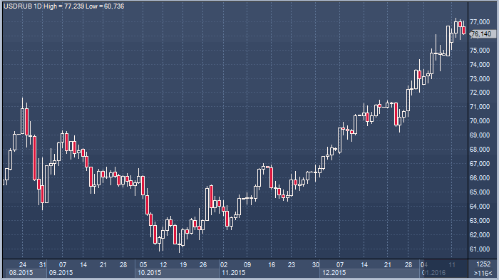 Татьяна Орлова, старший экономист из Royal Bank of Scotland, ожидает в дальнейшем ослабление курса рубля и рекомендует инвесторам отдать предпочтение покупкам в паре доллар/рубль на попытках снижения. Эксперт прогнозирует курс доллара к рублю на уровне 80.00, если цены на нефть марки Brent упадут до 26 долларов за баррель. Если же цены на Brent упадут до 16 долларов за баррель, курс доллар/рубль поднимется выше 90.00. Дальнейшее снижение нефтяных цен заставит инвесторов быть более обеспокоенными рисками в отношении России. RBS установил рекомендацию «хуже рынка» для еврооблигаций Россия-30. Источник: ProFinance.Ru - Новости рынка Forex