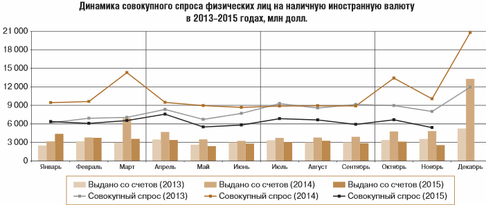 В ноябре 2015 года совокупный спрос населения на наличную иностранную валюту (сумма купленной в уполномоченных банках, полученной по конверсии и снятой с валютных счетов наличной иностранной валюты) по сравнению с октябрем сократился на 19% и составил 5,4 млрд долларов США в долларовом эквиваленте (далее – долларов). При этом его объем был меньше, чем в ноябре 2013 и 2014 годов, на 33 и 46% соответственно.