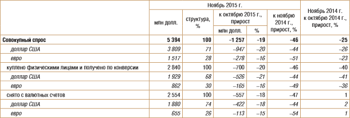 Спрос населения на доллары США в ноябре 2015 года по сравнению с предыдущим месяцем уменьшился на 20%, на евро – на 16%, составив 3,8 и 1,5 млрд долларов соответственно. Доля долларов США в структуре овокупного спроса сократилась до 71% относительно 72% месяцем ранее, доля европейской валюты увеличилась с 27 до 28%.