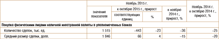 В ноябре 2015 года объем покупки населением наличной иностранной валюты в уполномоченных банках меньшился по сравнению с октябрем на 20% – до 2,8 млрд долларов. Долларов США было куплено на 21% меньше, чем месяцем ранее, евро – на 16%. Количество операций по покупке физическими лицами наличной ностранной валюты по сравнению с октябрем сократилось на 23% и составило 1,5 млн сделок. Средний размер сделки по покупке вырос на 4% и составил 1846 долларов.