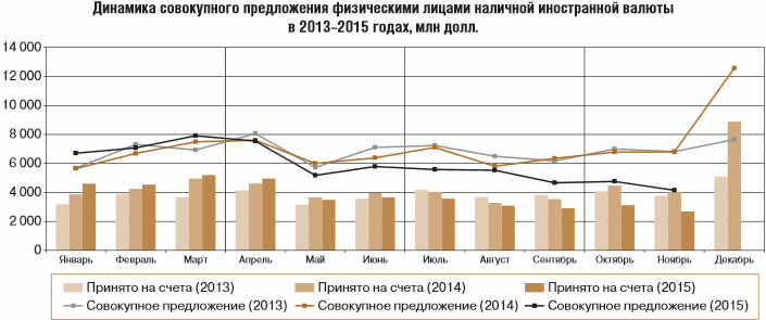 Совокупное предложение населением наличной иностранной валюты (сумма проданной в уполномоченных банках, направленной на конверсию и зачисленной на валютные счета наличной иностранной валюты) в ноябре 2015 ода по сравнению с октябрем сократилось на 13% и составило 4,1 млрд долларов. Объем совокупного предложения был меньше, чем в ноябре 2013 и 2014 годов, на 39%.
