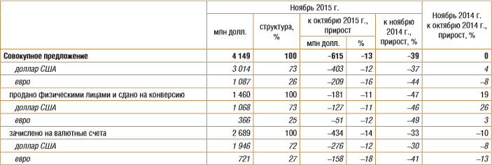 Совокупное предложение населением долларов США в ноябре 2015 года уменьшилось на 12%, евро – на 16%, составив 3,0 и 1,1 млрд долларов соответственно. Доля долларов США в структуре совокупного предложения возросла до 73% относительно 72% месяцем ранее, доля евро сократилась с 27 до 26%.