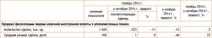 В ноябре 2015 года населением было продано уполномоченным банкам 1,5 млрд долларов наличной иностранной валюты, что на 11% меньше, чем месяцем ранее. Продажи долларов США сократились на 11%, евро – на 12%. Количество сделок по продаже населением наличной иностранной валюты по сравнению с октябрем снизилось на 11% и составило 1,8 млн сделок. Средний размер сделки практически не изменился и составил 766 долларов.