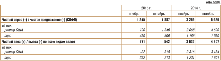 В ноябре 2015 года по сравнению с предыдущим месяцем чистый спрос населения на наличную иностранную валюту сократился на 34% и составил 1,2 млрд долларов. Чистый спрос на доллары США уменьшился на 41%, на евро – на 14%.
