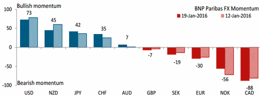 Валютные стратеги BNP Paribas обновили еженедельно публикуемую оценку текущей ситуации на валютном рынке, сгенерированную системой FX Momentum. Как следует из ее названия, система оценивает силу валютных трендов, исходя из текущей динамики валютных курсов, ставок и поведения фондового рынка. В приведенной ниже таблице указаны текущие оценки силы тренда основных валют по шкале от -100 (сильнейший медвежий моментум) до +100 (сильнейший бычий моментум).