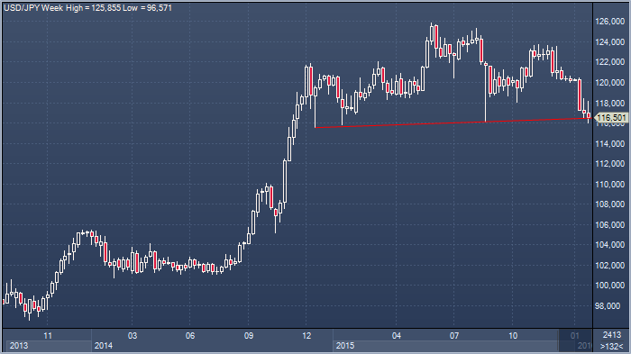 Японская валюта негативно, но, учитывая масштабы, весьма сдержанно реагирует на развитие нисходящей тенденции на фондовых рынках. Вместе с тем, картина в доллар/иене оставляет далеко не самое позитивное впечатление: пара не смогла вернуться выше Y118.50/00 и сегодня упала ниже линии шеи формации, весьма напоминающей голову и плечи. У быков еще остаются уровни поддержки, за которые они могут уцепиться, в частности минимумы декабря 2014 около Y115.57, а также . Кроме того, определенные надежды быки возлагают и на Банк Японии, который опубликует заявление по денежно-кредитной политики 29 января. Тем не менее, при сохранении текущего уровня аппетита к риску от пары сложно ожидать улучшения динамики, и вероятно дальнейшее соскальзывание курса в направлении Y114.50/00 (100-недельная sma/23.6% от роста с 2011), при этом, если надежды на Банк Японии не оправдаются не стоит исключать разочарования в стане быков и развития более глубокой коррекции. Источник: ProFinance.Ru - Новости рынка Forex