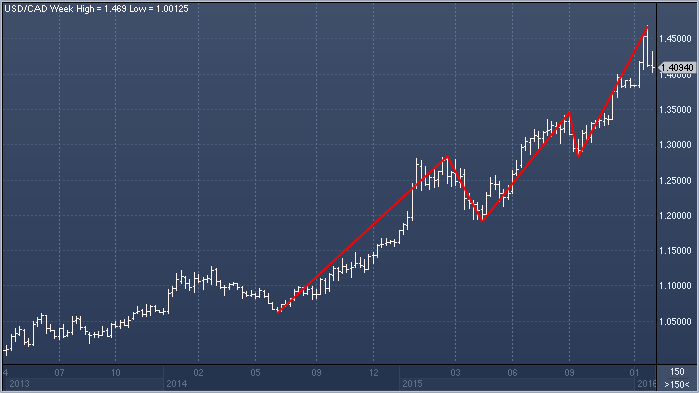 Нейтральная позиция Банка Канады и резкое восстановление цен на сырье оказывают поддержку канадской валюте, однако нашим базовым сценарием на 2016 год остается рост доллар/луни в область C$1.50. За последние 18 месяцев мы видели три эпизода сильного роста на 15-20 фигур, чередовавшихся с двумя эпизодами консолидации/коррекции, длившихся 3-4 месяца, во время которых пара отыгрывала примерно 1/3 предыдущего движения. Исходя из этих цифр, можно предположить, что доллар/луни имеет все шансы опуститься до C$1.38 и провести остаток этого квартала и часть следующего, консолидируясь в широком диапазоне, после чего возобновится рост с целью около C$1.50. По нашим прогнозам, Банк Канады снизит ставки к середине текущего года. Источник: ProFinance.Ru - Новости рынка Forex