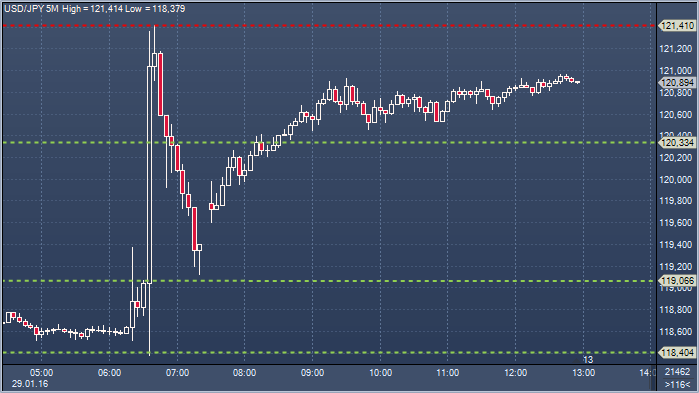 Доллар подскочил более чем на 2 % к иене до Y121.49, показав лучший результат за чуть больше месяца. Позднее американская валюта немного снизилась и сейчас торгуется на отметке в Y120.80. "Изначально доллар поднялся выше Y121 в связи с неожиданным введением отрицательной процентной ставки", - сказал Синдзи Куреда из Sumitomo Mitsui Banking Corporation в Токио.