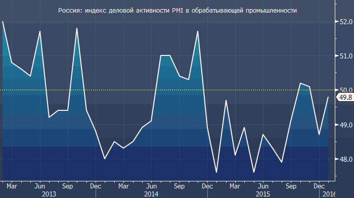 Россия. Индекс деловой активности PMI в обрабатывающем секторе в январе: 49.8 пункта против прогноза 47.5 пункта