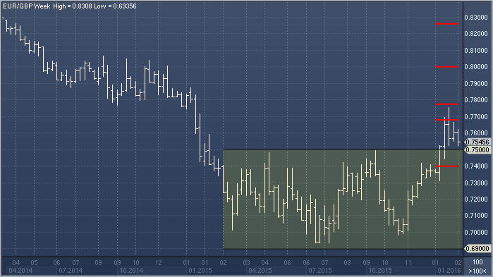 В середине января евро/фунт покинул диапазон stg0.69-stg0.75, в котором провел большую часть прошлого года, и, несмотря на текущую коррекцию, среднесрочный тренд продолжает быть нацеленным вверх. Ключевая поддержка расположена в области stg0.7480-40, и перед возобновлением аптренда мы ждем ее теста. Если эта поддержка, а затем и следующая около stg0.74 будут пробиты, аптренд отменится, и пара вернется в режим диапазонной торговли. В то же время, до тех пор, пока евро/фунт торгуется выше указанных уровней, мы ждем возобновления роста и теста сопротивлений stg0.7680 и stg0.7755. Следующее важное сопротивление – stg0.80, а более долгосрочной целью является отметка stg0.8260. Источник: ProFinance.Ru - Новости рынка Forex